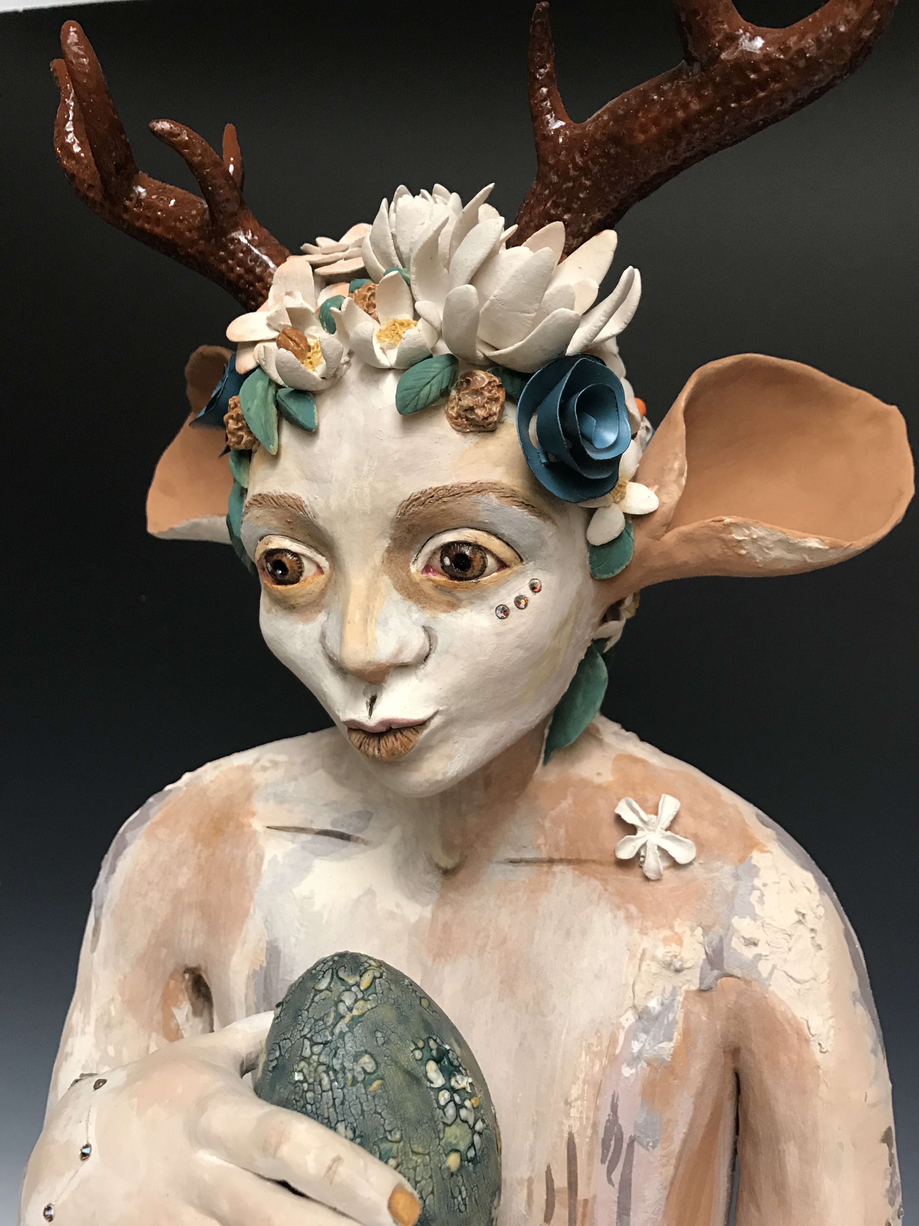Of course it didn’t help when my daughter prepared for Renaissance Festival earlier this Spring, and once again she was determined to wear horns with her costume. This concept of altering your persona and acquiring “super powers” by placing horns on your head began to brew inside, and the idea of exploring that concept with spirituality in my new body of work was becoming more defined each day.